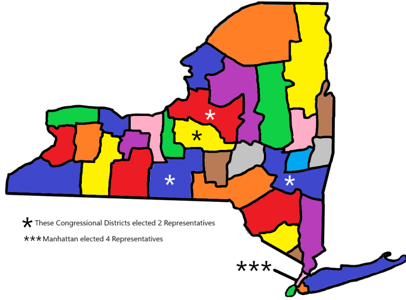 A few of New York’s districts were represented by multiple people as seen on the map. Manhattan elected 4 representatives at large as at the time there was hesitancy of county splitting due to issues with ensuring equal population numbers and getting precinct polling locations.