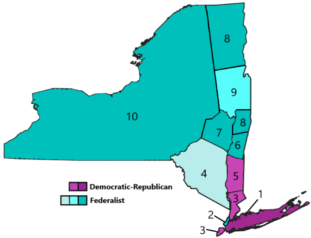 While New York’s representation after the election was proportional to its partisan popular vote (54% federalist), others states attempted creating districts to unseat political opponents such as in Virginia. Many Federalist states at the time elected a slate of candidates from the entire state in avoiding the district system, which naturally lessens minority representation.