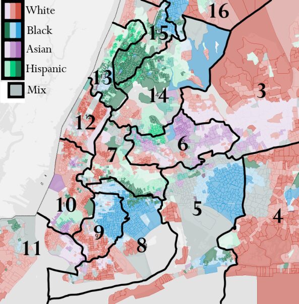 New York City 2024 Congressional Map with Racial Data, (Lines often reflect racial groups to ensure representation)